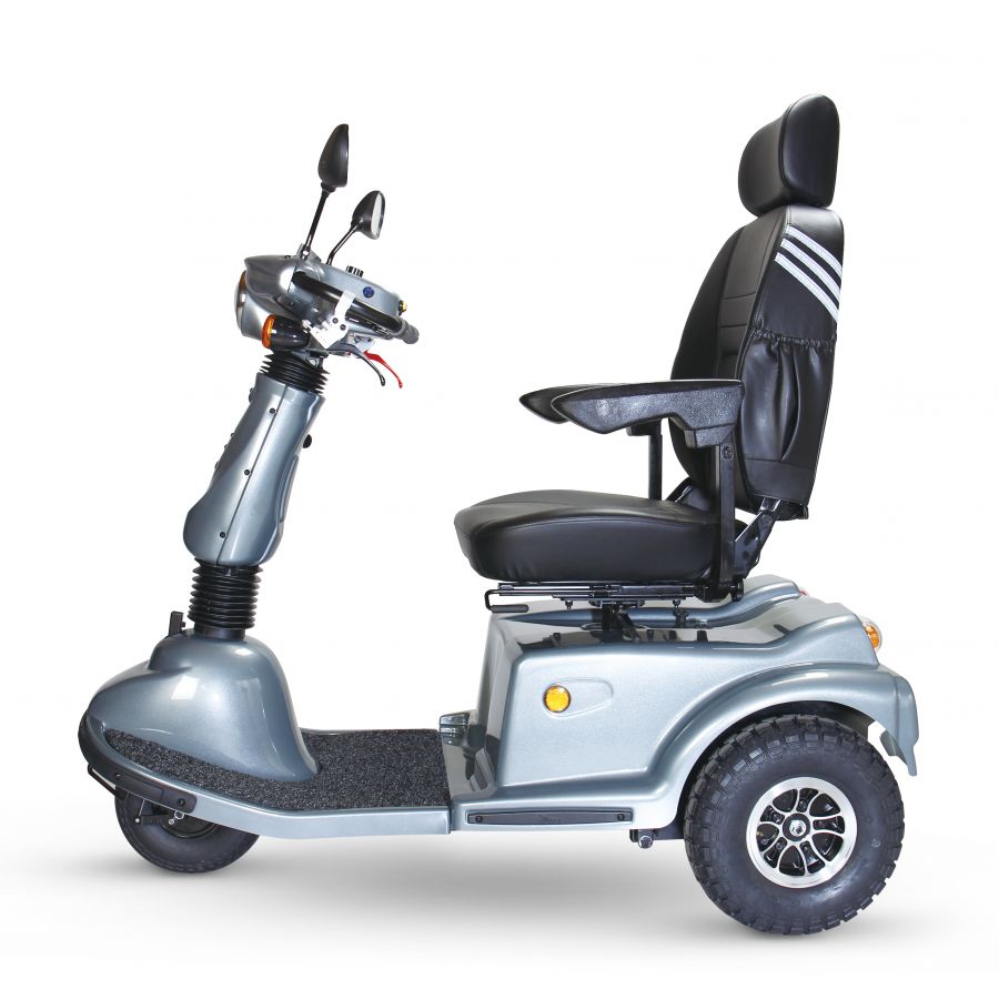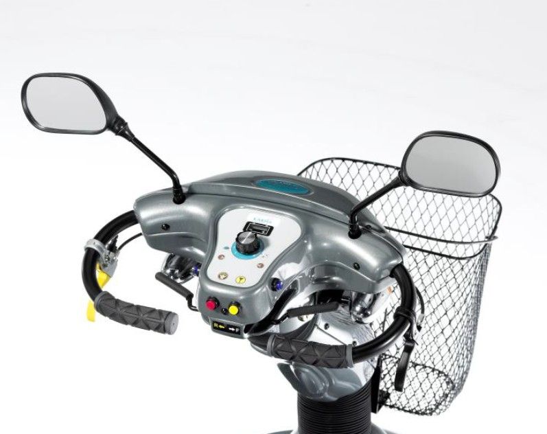 Kan klare en brugervægt på op til 160 kg - og er også perfekt til dig, der er høj eller har lange ben. God og stabil el-scooter med 3 hjul. Kan køres med højre eller venstre hånd. Drejesæde på glideskinne med justerbar ryg. Opklappelige armlæn, der kan indstilles i bredden og højden. Styret kan justeres frem og tilbage.
