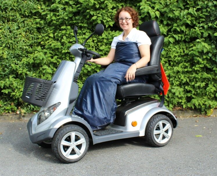 Firkantet "Slå om-tæppe", der kan bredes ud over sædet og når man har sat sig, derefter lukkes med velcro lukning. Vandafvisende polyestermateriale. Blå. Indvendigt foret med polar fleece.
